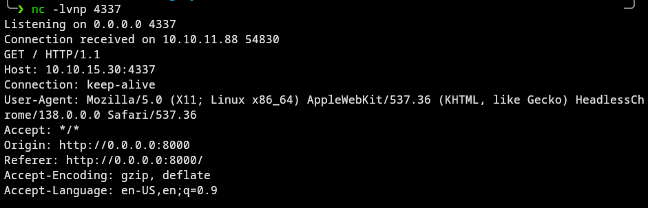 In order to see if that could "ping" my machine, ofcourse I had a nc listerner running on port 4337.