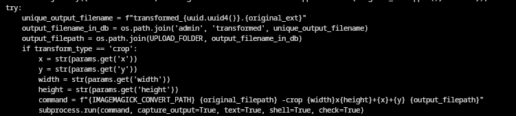 One transform option is crop, which executes an IMAGEMAGICK command with shell=True — a possible command injection point.